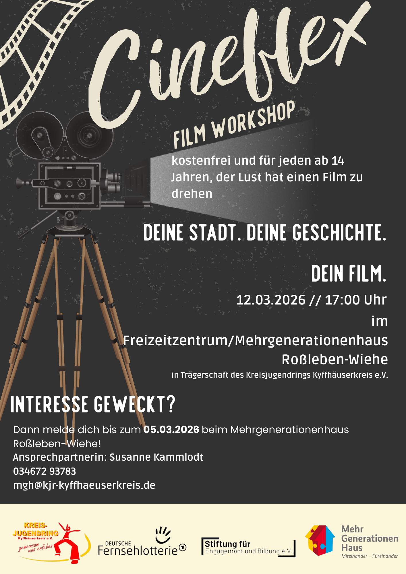 In einem Workshop am 12.03.2026 um 17:00 Uhr im Freizeitzentrum/Mehrgenerationenhaus Roßleben-Wiehe (Thomas-Müntzer-Straße 1a, 06571 Roßleben-Wiehe) erarbeiten wir gemeinsam ein Drehbuch und anschließend (bei einem kommenden Termin) wird mit professioneller Regie- und Kameraführung gedreht!